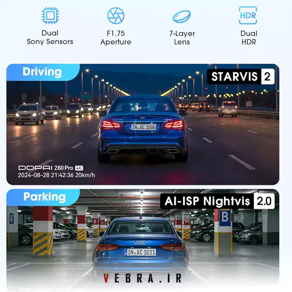 اگر به فکر نظارت کامل خودروی خود هستید، دوربین ثبت وقایع 3 لنز z60 برند DDPAI این امکان را با داشتن سه لنز جلو، داخل کابین و عقب برای شما فراهم می‌کند. این محصول مچهز به کیفیت 4K و 2K است و از همین رو تصاویری با کیفیت بالا را ضبط و ثبت می‌کند. همچنین مجهز به قابلیت دید در شب می‌باشد و به همین علت قادر است حتی در تاریکی مطلق نیز وقایع را ثبت کند. از دیگر امکانات این دوربین ثبت وقایع، وای فای داخلی است که امکان مشاهده‌ی تصاویر را از طریق نرم افزار برای شما فراهم می‌کند. از دیگر ویژگی‌ها عبارتند از: