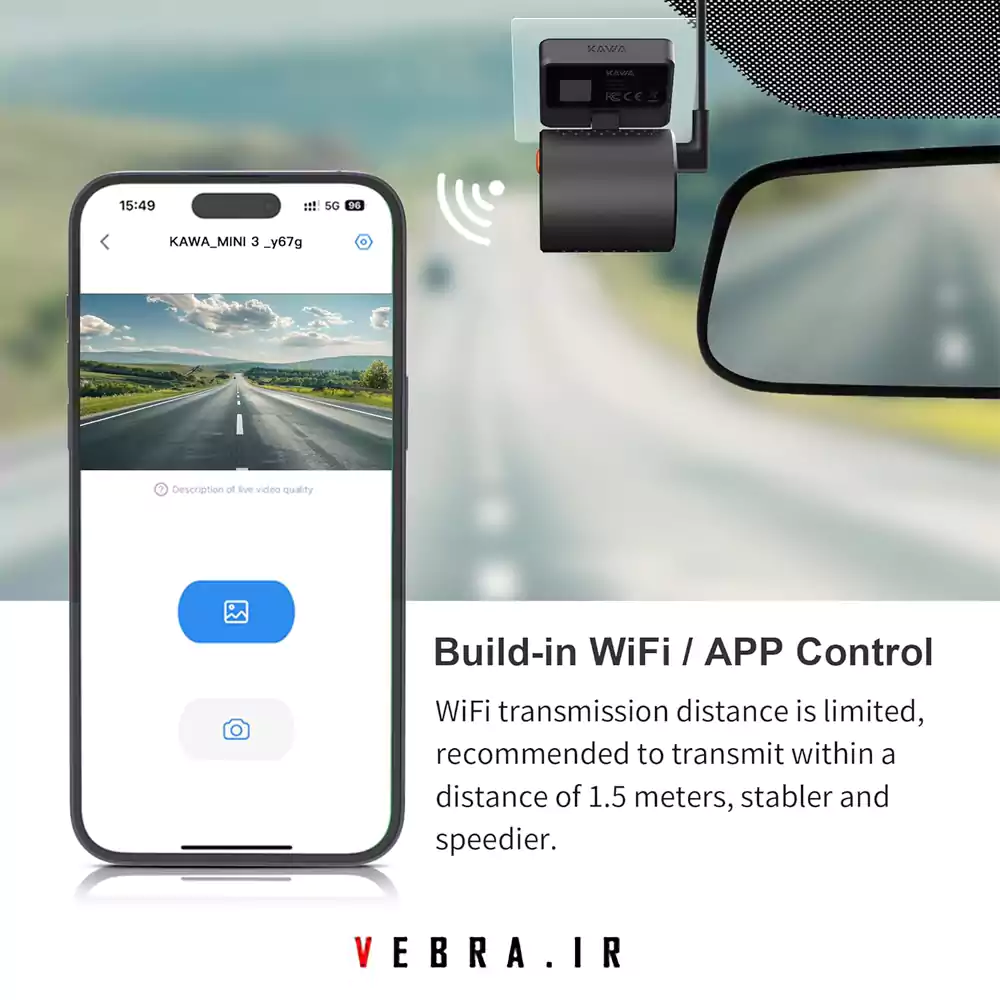 - دوربین خودرو 1 لنز kawa مدل mini3 مجهز به وای فای داخلی بوده و به شما این امکان را میدهد تا بتوانید از طریق گوشی همراه به دوربین متصل شده و فیلمهای ضبط شده را در نرم افزار مشاهده نمایید و یا آنها را دانلود کرده و با دیگران به اشتراک بگذارید. نرم افزار این دستگاه روی اندروید و ios قابل نصب و میتوانید آن را از گوگل پلی و یا اپ استور دانلود کنید.