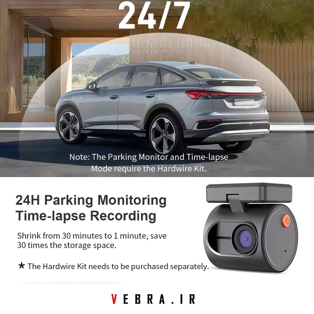 - مجهز بودن به قابلیت مد پارکینگ به این معناست که دوربین حتی در زمان پارک خودرو نیز از آن محافظت میکند. عملکرد این ویژگی به این صورت است که چند دقیقه پس از خاموش شدن خودرو، دوربین وارد حالت استندبای میشود و اگر ضربهای به خودرو وارد شود، به طور خودکار فعال شده و شروع به فیلمبرداری میکند.